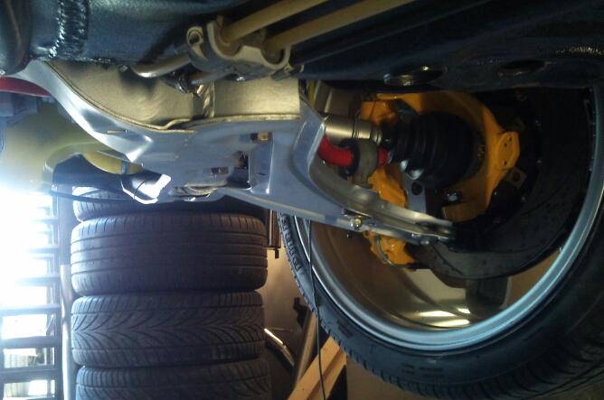 The front brakes callipers are mitsubishi evo fq320 4 pot brembos and the two piece rotors are black diamond 320x32 but they did need a specially machined spacer ring on the back of the bell to offset the rotor. The wheels arent the best make but it was a real struggle to find alloys where the spokes cleared the big brembos and that wasnt motorsport derived yet still the wheel offset had to be machined to get them back as close to the favoured vauxhall offset but leaving just enough calliper clearance. nightmare really!