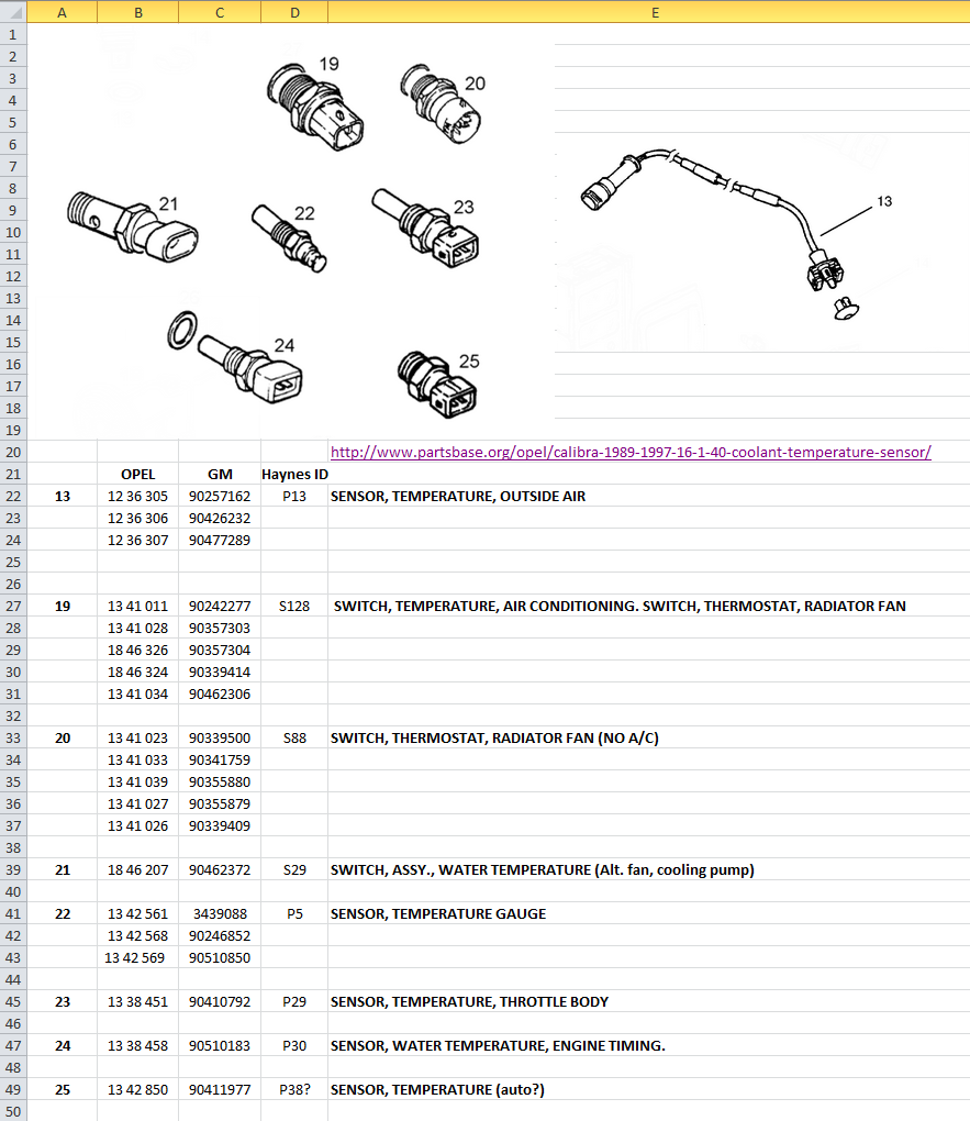 Anyway, my Calibra V6 still going strong but the cooling system is running on way too long after switching the engine off. So using the Haynes wiring diagram I think I've traced it down to S29 (located on the coolant bridge I think) but after half a day's googling I'm still not sure what part number this is to order. The ECU has a sensor, the temp. gauge has a sensor, the Main Fan has a sensor (switch) but all the parts catalogues I've looked at online don't help to distinguish between them. Often they call a switch a sensor which doesn't help. Any pointers to the GM code?