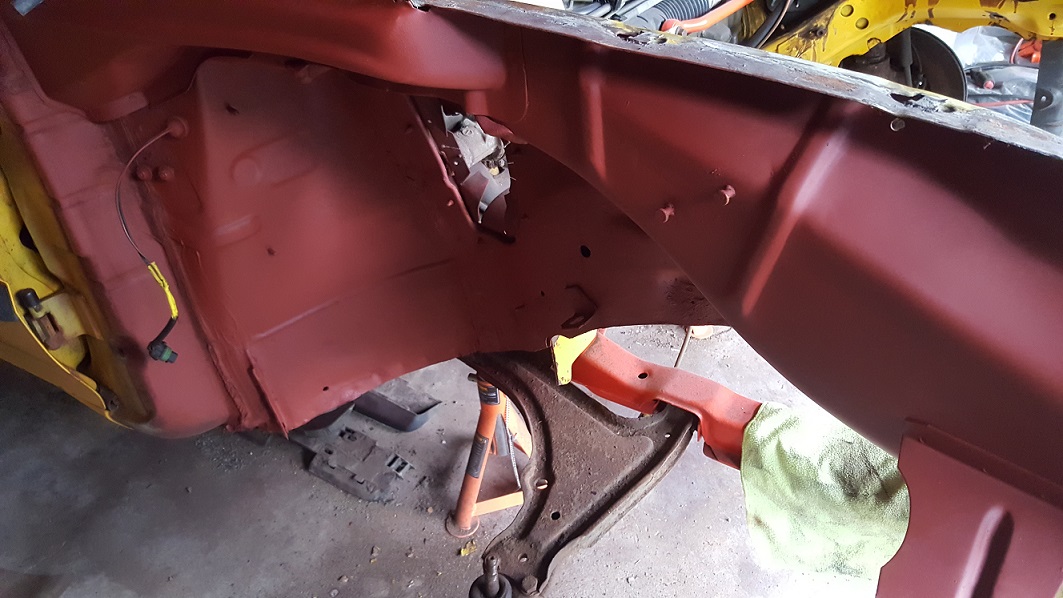 well i am getting closer to getting some colour back on the se2 at last i have flatted and smoothed down the slam panel and wheel tub and gave them a coat of red oxide primer for now then will be a under-seal coat then colour just need to do the other tub and the rest of the bay i am getting there Rome wasn't built in a day so they say lol