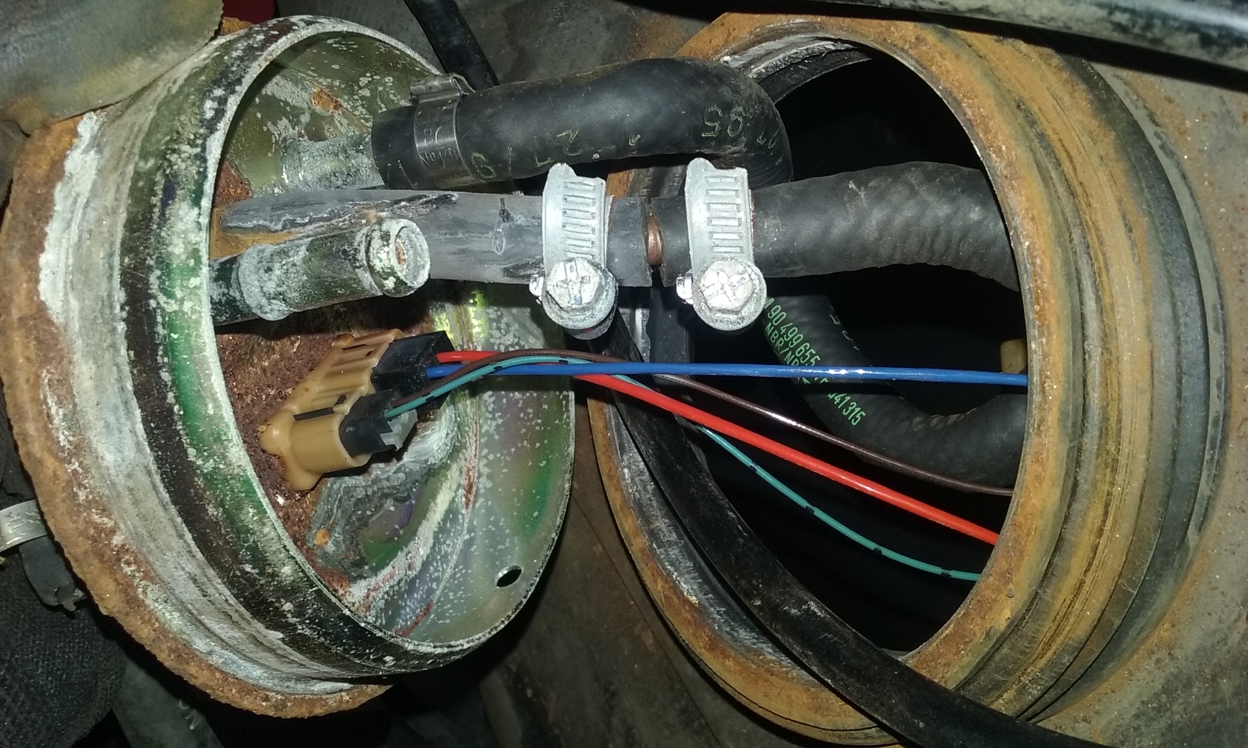 . I have been out to the hut and dug out my spare tank from my old ecotec to prove it fits. The 1st photo shows the plugs for the fuel pump and sender unit that we need to be able to remove to change the pump/sender.