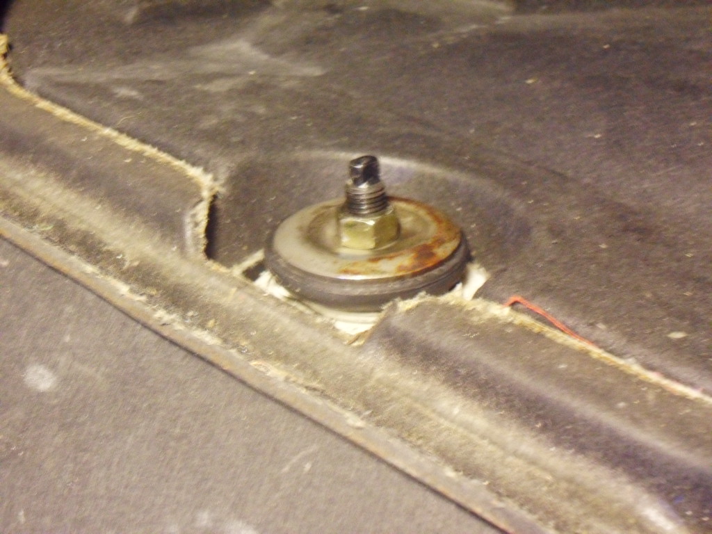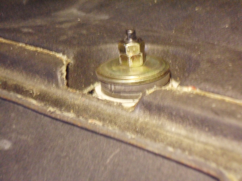 Some i have seen have had a shaped, sort of convex/cupped washer on the top, and as you can see, mine is a plain old flat one....and i have a feeling that is what could be causing my rear suspension to knock, as the metal sleeve in the lower rubber will be knocking up against that when the rear shocks move.